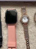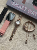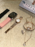 The smartwatch features Bluetooth calling, fitness & health monitoring, and sport modes, while the jewelry-inspired watch and accessories elevate your look instantly.
