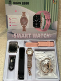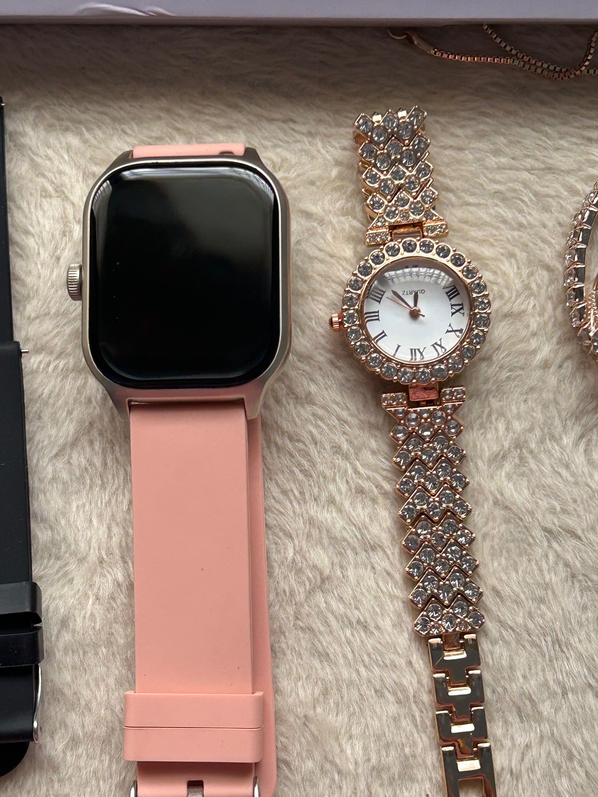 Stay connected and stylish with the CROWN Q800 Smart Watch Gift Set, a perfect blend of technology and elegance. This premium combo includes a smartwatch, a diamond-cut luxury analog watch, and a matching jewelry set—ideal for gifting or everyday glam.